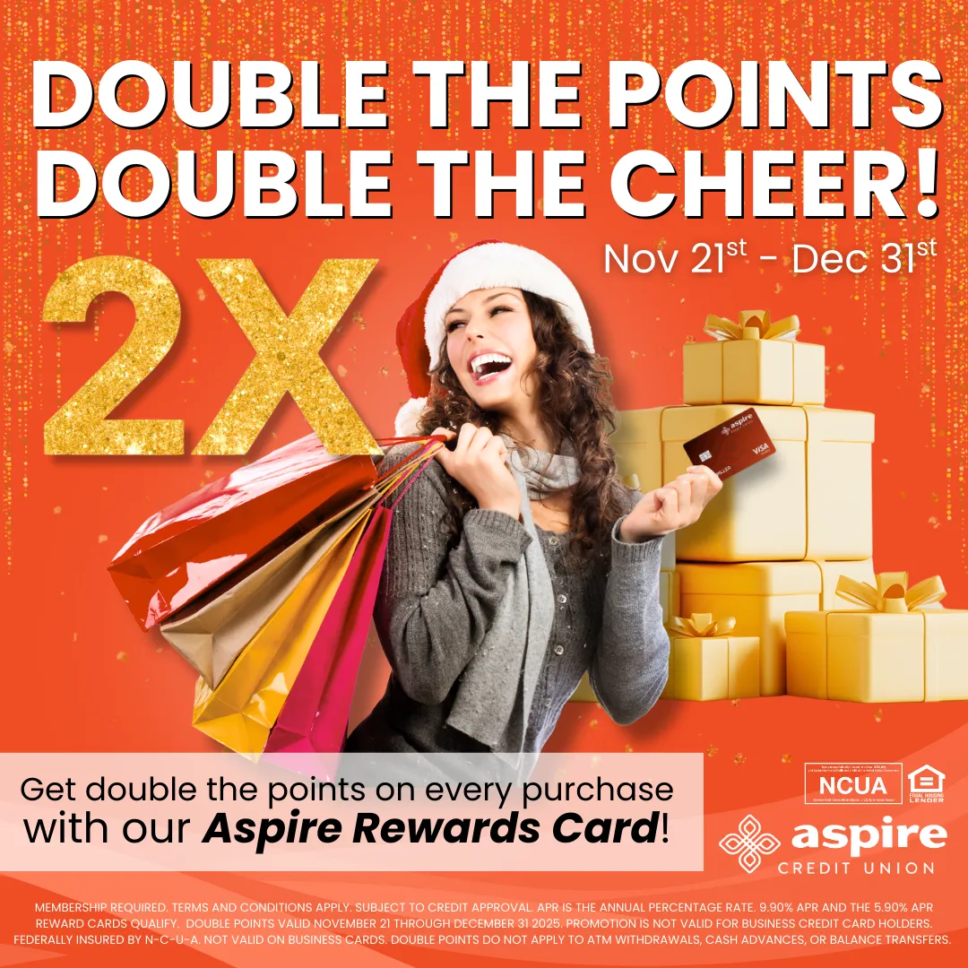 Aspire Rewards Visa Card and Student Visa Card holders will receive double points from November 21st to December 31st! Both cards take advantage of the uChoose Rewards® program that gives you cash back for merch, travel, and more!